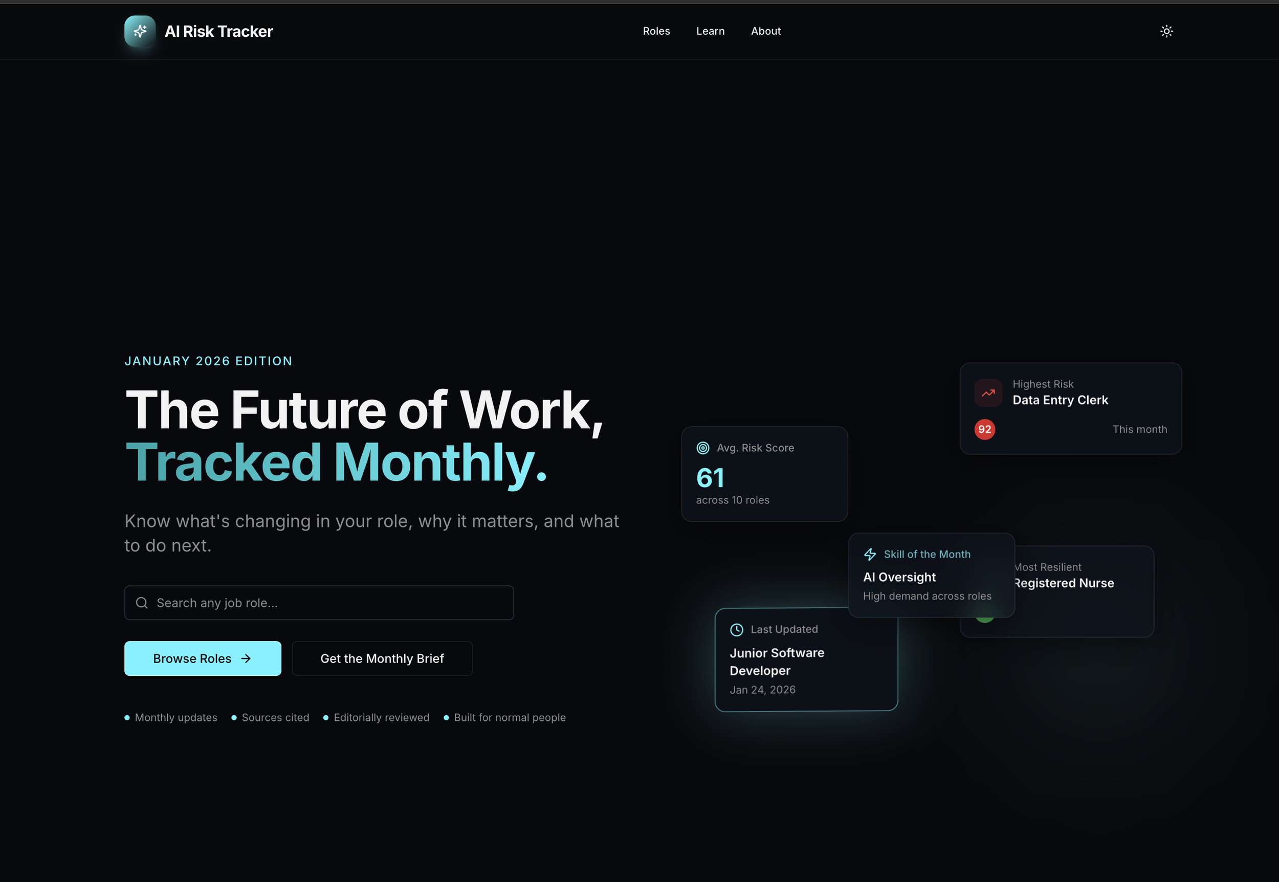 AI FUTURE TRAK is a SaaS platform that helps people and organizations track how AI is reshaping work—by industry, role, and skill set—so they can make smarter career and workforce decisions.